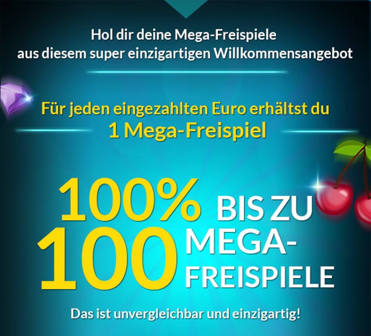 Bonus: 1 Freispiel im Wert von je 1 € pro eingezahltem € – maximal 100 Freispiele
