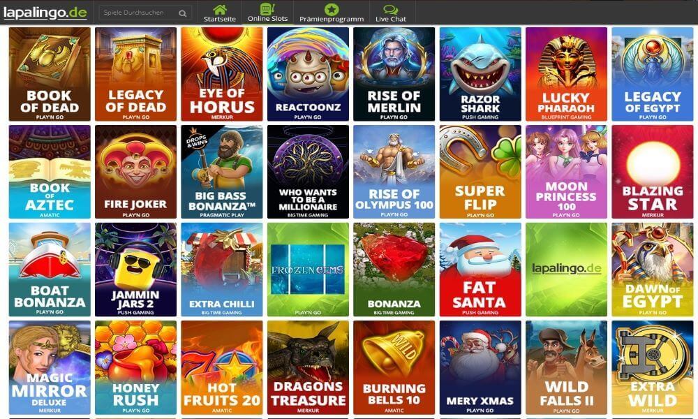 Bei Lapalingo erwartet dich ein umfangreiches Spiele-Portfolio namhafter Entwickler. Dazu gehören Dauerbrenner wie “Eye of Horus” und “Blazing Star” von Merkur, “Book of Dead” und “Fire Joker” von Play’n GO. Aber auch “Ramses Book” oder “La Dolce Vita” aus dem Hause Gamomat sowie Online-Slots von Pragmatic Play findest du in ihrem Angebot.