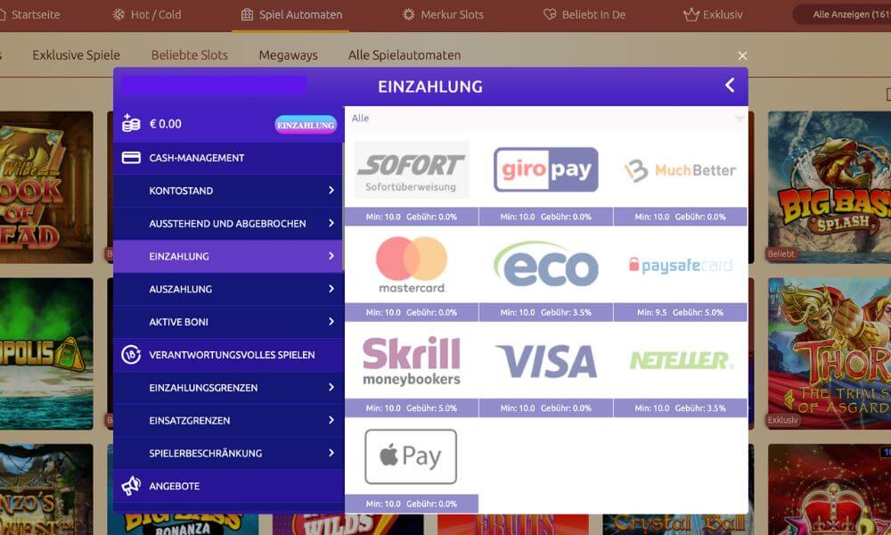Der Mindesteinzahlungsbetrag liegt bei den Zahlungsmethoden bei 10 €. Das gesetzliche Limit pro Monat liegt bei 1.000 €. Die virtuelle Spielothek bietet dir dafür verschiedene Möglichkeiten an. Neben der Visa- und Mastercard-Kreditkarte gehören auch Giropay, Skrill oder Sofortüberweisung zu den Zahlungsmöglichkeiten.