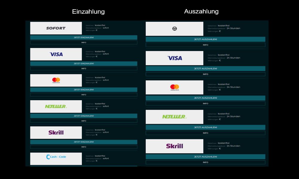 In der Online-Spielothek Tigerspin kannst du verschiedene Zahlungsmethoden für deine Ein- und Auszahlungen nutzen. Neben der Zahlung per Kreditkarte kannst du auch mit Sofort, Neteller, Skrill und CashToCode einzahlen.